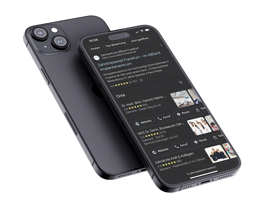 Sie sprechen Ihre kalte Zielgruppe zu relevanten Suchanfragen (z.B. Implantologie Frankfurt) mit Suchmaschinenoptimierung, GEO oder Google Ads an. Hier lenken Sie erste Aufmerksamkeit auf Ihre Praxis. An dieser Stelle ist es bereits wichtig, Das Ihr Google Unternehmensprofil vollständig ausgefüllt ist, um in lokalen Suchergebnissen sichtbar zu sein. Unser Tipp: Das aktive Einholen von Google-Bewertungen steigert an dieser Stelle das Vertrauen von Patienten.