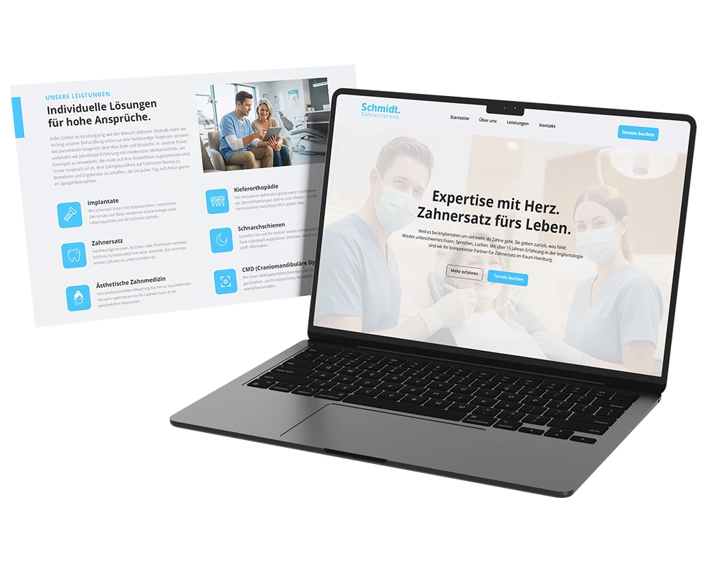 Auf Ihrer Website liefern Sie die informative Grundlage rund um Ihr Behandlungsspektrum, Team und Ihre Person. Die Website muss schnell laden und für Handys optimiert sein, um eine niedrige Absprungrate zu gewährleisten.